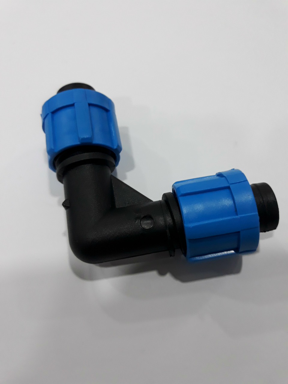 Кут затискний для крапельної стрічки . Використовуються цей фітинг під час монтажу крапельної стрічки дуже часто, на повороті стрічки монтується фітинг, крапельна стрічка затискається з обох боків накидними гайками , затискається щільно, саме за цим це ефективний спосіб загорнути крапельну стрічку.